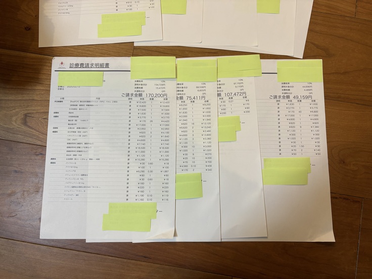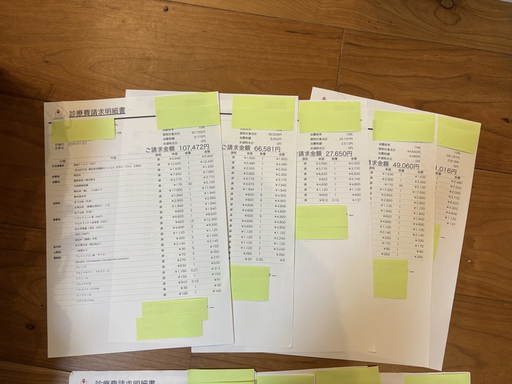 大学病院の検査報告と診察費用をまとめた所。ざっと70万程かかりました。