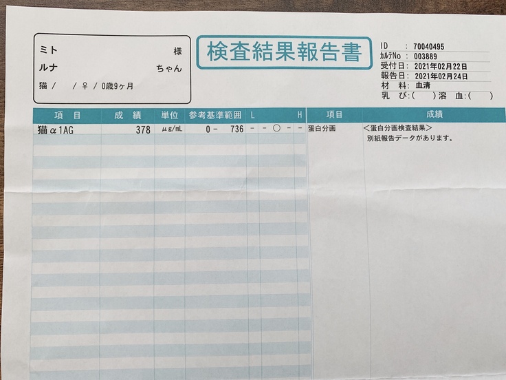 最初は「猫α1AG」の値が2000と基準値(0〜736)を大幅に上回ってましたが