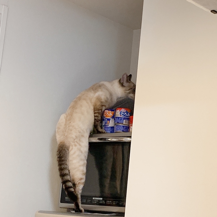 レンジの上はご飯やおやつを置いてたのですが、登れることを覚えてしまいました。