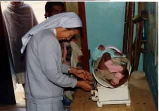 (※シスター牧野を支援する会のHPより。新生児の体重測定)