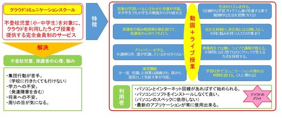 今回のプロジェクトでは、様々な理由で学校に行きたくても行けない不登校の子供達のために、小学4年生~中学3年生までの不登校児童を対象に「動画」+「ライブ」の授業をウェブ配信する事業です。