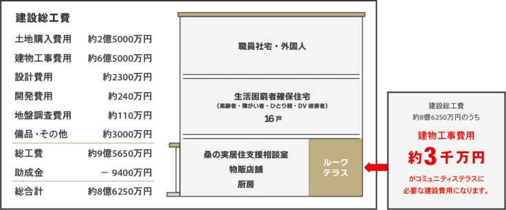 国土交通省の「人生100年時代を支える住まい環境整備モデル事業」と埼玉県の「職員宿舎整備事業」に採択され、あわせて約1億円の助成金を支給される予定です。残り9億円は、社会福祉法人 桑の実会が負担します。