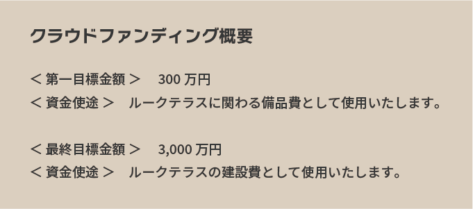 ※目標金額を上回る資金が集まった場合は、建設総工費として使用させていただきます。