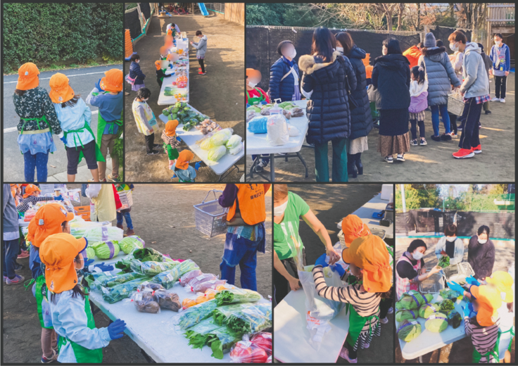 JAさんの野菜を子どもたちが園庭にて販売する事から始め、徐々に地域的認知度も上がり、最終的には地域のパン屋さんや魚屋さんも参加した複合型のマルシェとなりました。