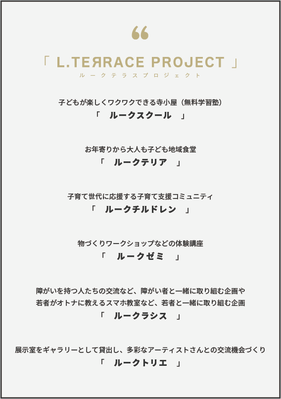 まずは、誰もがやりたいことに支え合う「L.TERRACE PROJECT」を、はじめてみる一歩を踏み出してまいります。