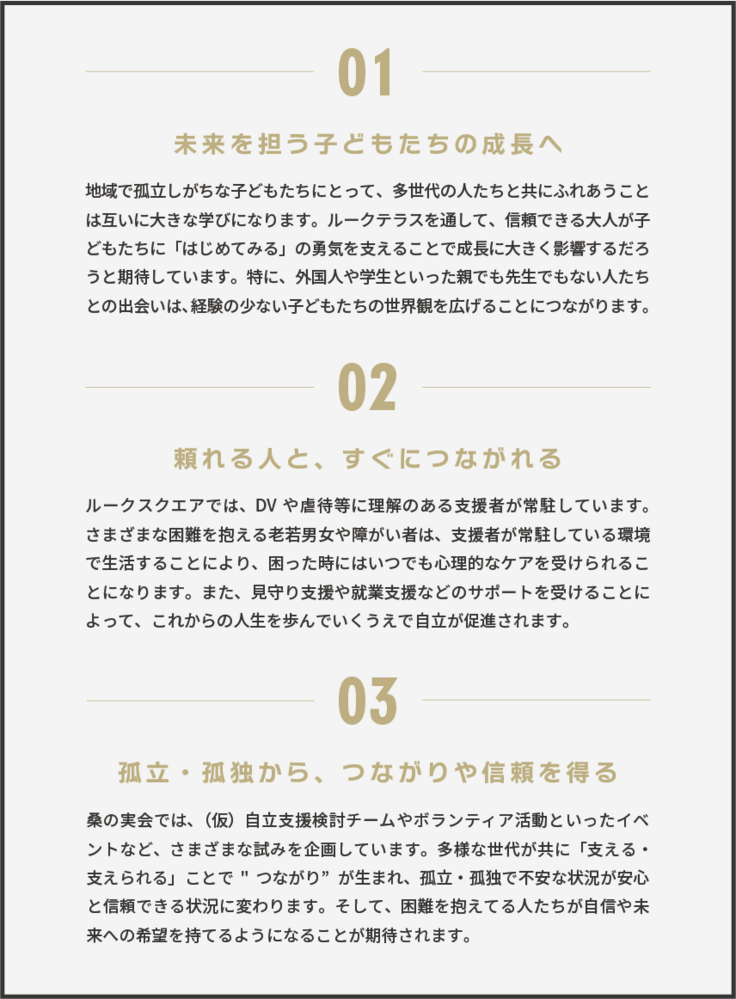 そうならないためには、私たちのつくる次世代地域交流スペース「ルークテラス」が、つらい気持ちを我慢して孤立している人たちの居場所となり、ひとりぼっちにしない環境づくりをします。