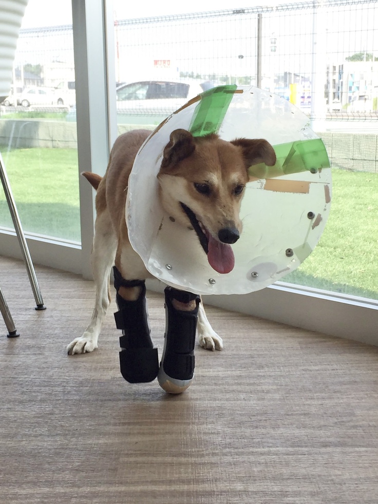 ▼病院で、初めて義足を装着したニコちゃん、この後、病院のドッグランも楽しそうに歩いていました。やっとこの状態までもってこられたと、ほっとしました。