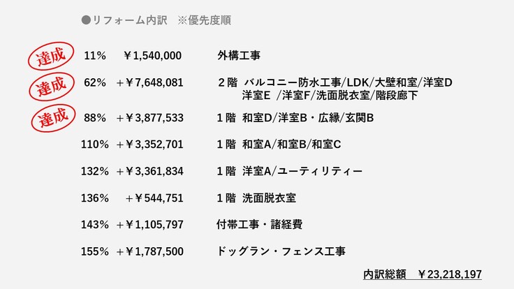 110%まで届くことができれば、隔離部屋と犬部屋2のリフォームを実施することができます。