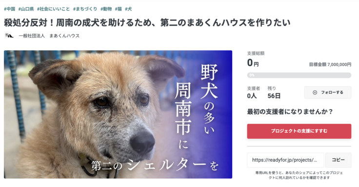 そこで、8月4日(金)より、新たにクラウドファンディングに挑戦し、周南市に周南保健センターの成犬を助けるためのシェルター「まあくんの家」を建設を目指します!