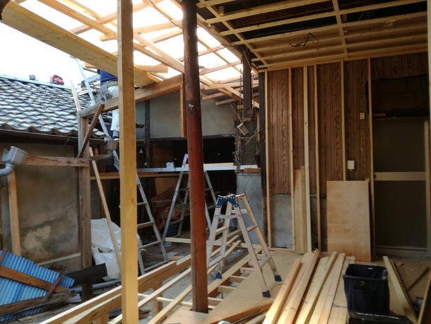 さて、学び舎ゲストハウス「Machi+Goto」の物件は2017年5月に引き継ぎ契約成立しています。その後、大工さんによる基礎や木工作業を進めています。特に渡り廊下やシャワールームの増設は完了したところです。