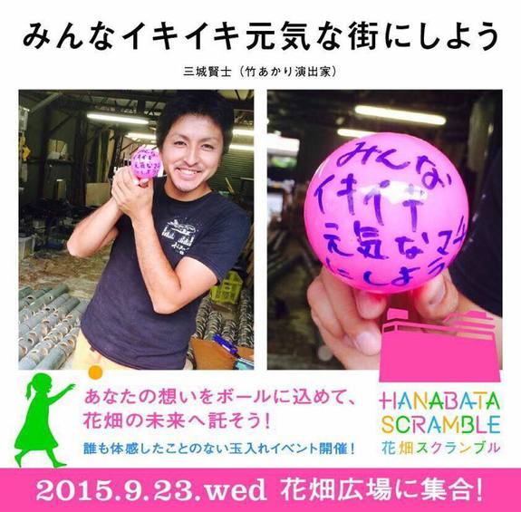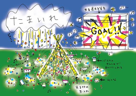 まず、玉入れに使うボールに「まちへの想い、未来への想い」を書き込み、ボールに書き込んだメッセージを未来に向かって投げてもらいます。