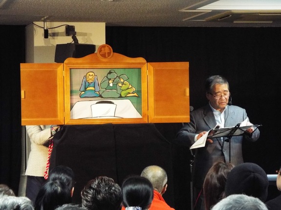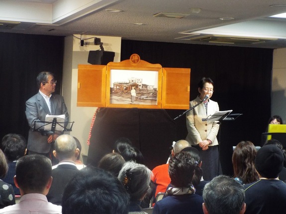 新地町は、福島県の最北、宮城県との県境に位置するまちで、始めに新地町に伝わる「困ったときはお互い様」という心を200年の時を経て伝えられたことにより早い時期に集団移転につながったことを伝える「豆名月」を紙芝居の上演をしていただきました。このほか、新地町を知っていただくため、新地町に伝わる民話「鹿狼山の手長明神」、被災後7日間の様子を伝えるために「朝日館 女将の7DAYS」の合計3本の紙芝居を上演しました。被災当時の様子から今日までの歩みと心の復興の様子を被災後お世話になった方への恩返しとして自身の体験を伝えることを続けていくこと、普通に暮らしていた主婦が放射能の影響により住めない町が時の経過により荒れ果てていく町を不安に思いながらも、諦めず自分たちの手で語り合う場所づくりやお蚕さんを育て織物を作る活動を始めたことなどを3人のパネリストから語っていただきました。