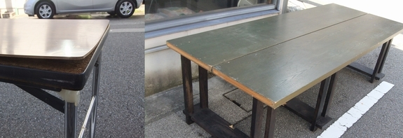 (めくれた天板(左)と、収納扉を外して作った陳列用のテーブル)