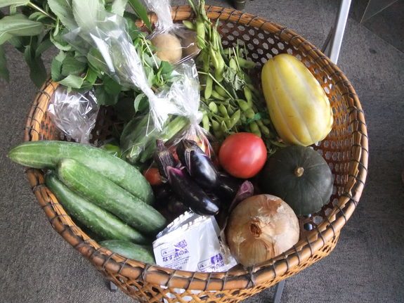 ◯季節と趣味のとれたて野菜1かご分(「大地のめぐみ」販売価格で1000円ほどの詰め合わせになります。分量の目安は左の写真をご覧ください)