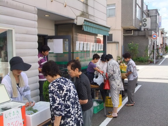 そこで、「野菜がほしい」「余った野菜をどうしよう」との両方の声に応えるため、農村の新鮮な野菜を採ってきて事務所の一角で販売してはどうかと企画し、今年5月12日に「まちなか八百屋のほほえみ農園・大地のめぐみ」を実験的に2時間だけ行いました。すると、オープン前から行列ができるほど近所の人が集まって、普段は人通りのない街に賑わいが生まれました。