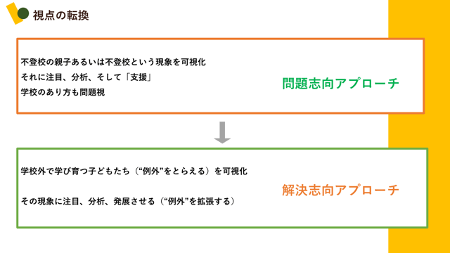 「少数派ではあっても、すでに枠から飛び出して、のびのびマイペースで学んでいる子がここにいるよ!それを支えるスクールや居場所があり、支える大人がいるんだよ!」