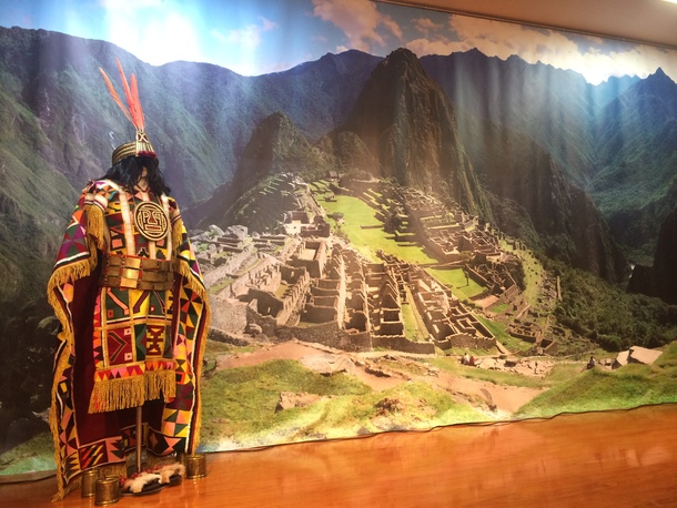 (資料館内:マチュピチュ遺跡巨大写真とインカの衣装展示)