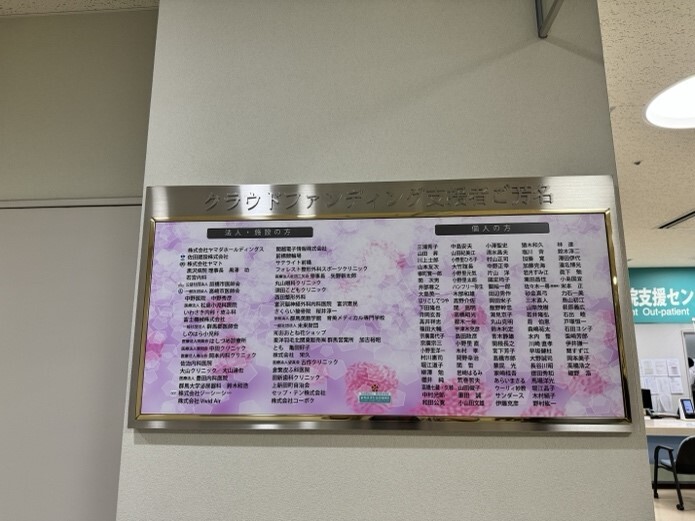 2月2日に当院ホームページに支援者一覧のお名前を掲載いたしました(病院紹介のカテゴリーにあります)。また5月20日に芳名板をA棟1階エレベータ横に設置しました。