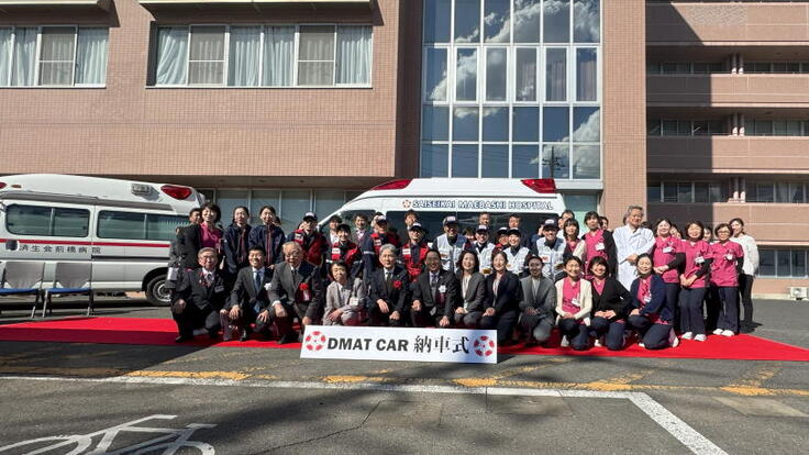 2025年(令和7年)2月26日に来賓、市民、報道関係者等の方々にお集まりいただき、病院正面玄関前にてDMATカーの納車式を開催しました。納車式後はDMATチーム員等に対する車や機器の説明が行われ、参加者も一緒に車内の医療機器等を見学しました。