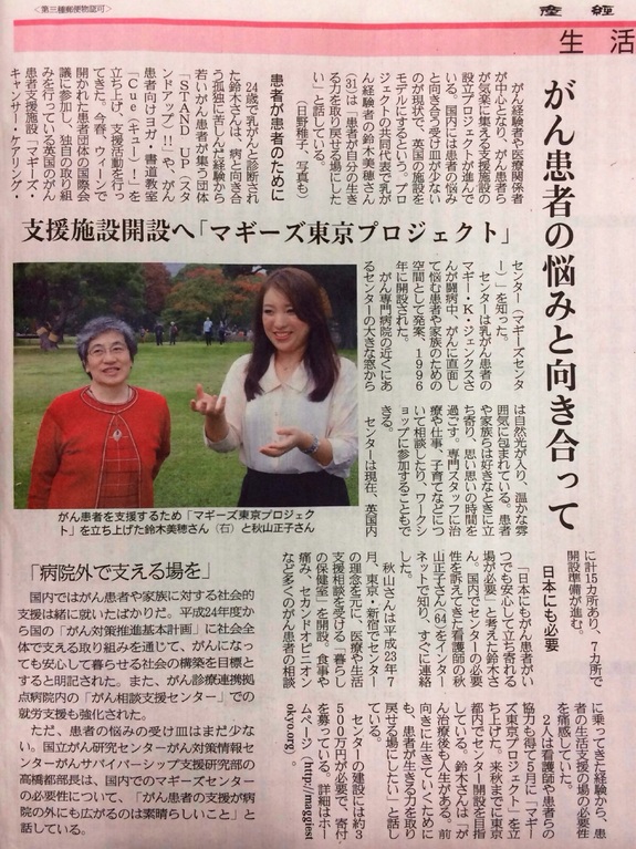 今朝の産経新聞生活面にmaggie's tokyoが取り上げられています!