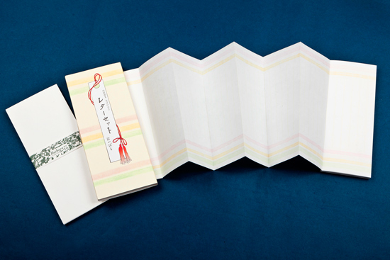 巻紙から着想を得た蛇腹便箋は、各折り目にミシン目が入っているので、書き終わったところで切ることができます。日常の想いを綴るなど、気軽に使っていただけます。「色はけびき」の平行で清らかな色帯は、穏やかな日々がどこまでも続く吉祥の意味を持っています。