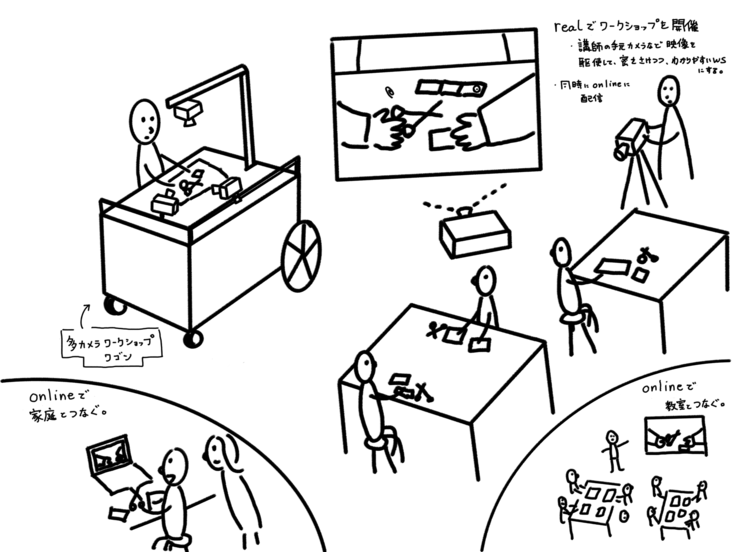 オフラインでも講師の手元などを大画面に映像で投影することにより、密になることを避けることができ、かつ分かりやすい工作ワークショップを提供します。また現地での様子をオンラインの参加者に中継することで、オンラインで一人で机に向かっている子にも、現地の空気を伝えたいと考えています。