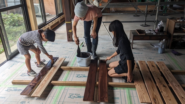 「お〜い、子供達!柿渋塗ろう〜」↓