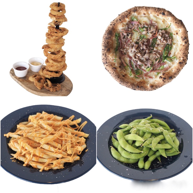 サクッと飲みたい方、ガッツリ食べたい方、どちらにもお楽しみいただける2種類のコースをご用意します。「おつまみ盛り合わせ+飲み放題コース」は生ハムやチーズ、ラタトゥイユなどお酒に合うおつまみと飲み放題のセットコースです。バゲットも付いているので好きなものを気軽にディップしてお楽しみいただけます。ガッツリ食べたい方には「グリルプレート+飲み放題コース」がおすすめです。牛、豚、鳥の3種のお肉に加え、エビや野菜を贅沢にグリルしたグリルプレートは彩りも鮮やかでビールが進むこと間違いなし!もちろん、コースの他にも職人が生地から作り500℃以上の薪窯で焼き上げる本格ピッツァやフライドポテトなど、アラカルトメニューも数多くご用意します。
