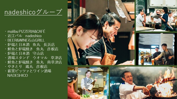 私たち株式会社nadeshico(なでしこ)は、滋賀県内で11店の飲食店を運営する滋賀県最大級の飲食店グループです。「人をオモイ、街をイロドリ、時をモテナス」を合言葉に、食を通じて世界を変えたいという思いで飲食店の運営やサポート、商品のブランド化、店舗デザインなどを手掛けています。