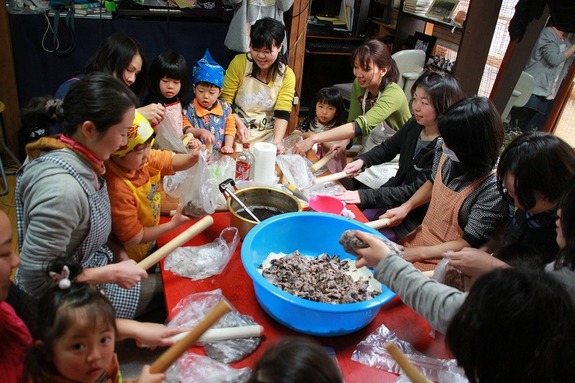 (ママメンバーと子ども達で味噌仕込みをしています♪)