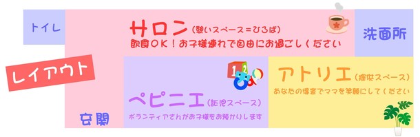 開設後の運営についてですが、アパートの1室を借りて運営を行います。間取りは2DKで、DKを「サロン(憩いのスペース=子育てひろば)」、1室を「ペピニエ(託児スペース)」、1室を「アトリエ(学びと癒しのスペース)」とします。