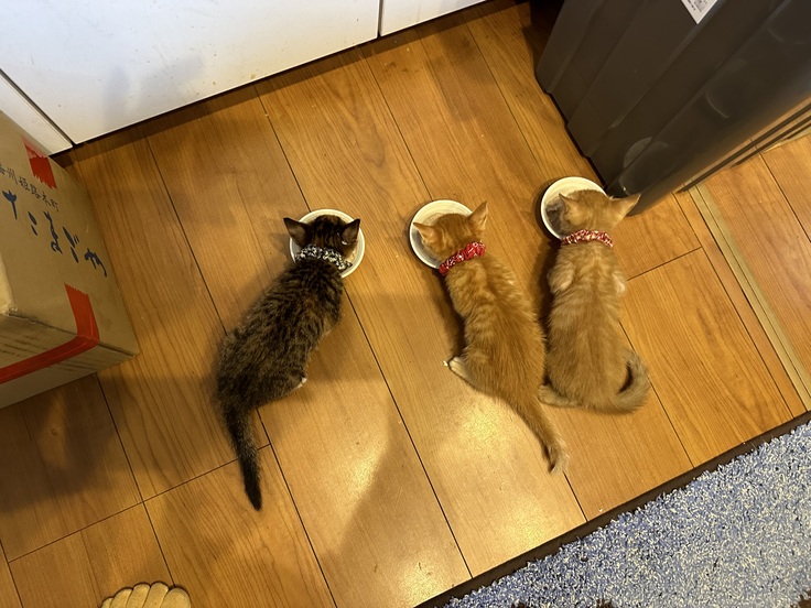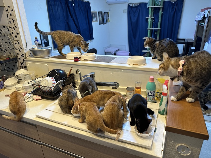1歳を過ぎた子達は後でもゆっくりもらえる事がわかっているので静かに待っていますがちび達は凄い勢い🐱