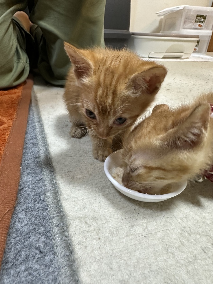 夜の餌やりの時にまたまだ生後1ヶ月半くらいの子猫がぼっちでいたのを保護したと