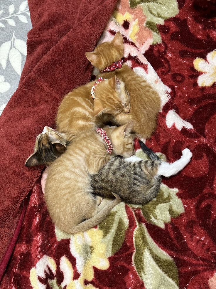 夕ご飯が終わると乳飲子4匹一緒に猫団子になって寝ます😊