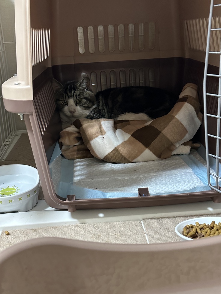 昨日避妊手術をした子達を夜リターンしに行ったんですが、怪我をしてて縫合治療をした子が何故かなかなかキャリーケースから出なくて、様子がしんどそうだったのでウチに連れて帰りました🐱