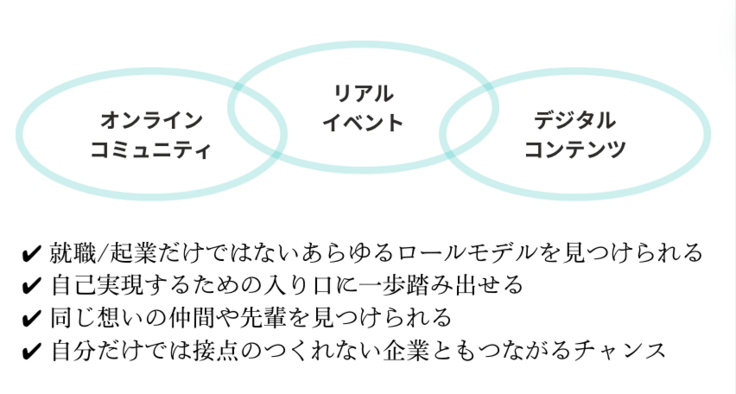 これら3つによって、"支援が間に合わなかった"世代の女性が殻を破り、仲間を見つけ、あらゆる可能性の実現まで継続できる学びと出会いのコミュニティづくりを目指しています。