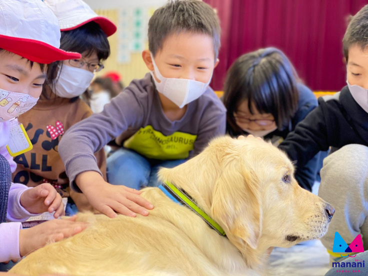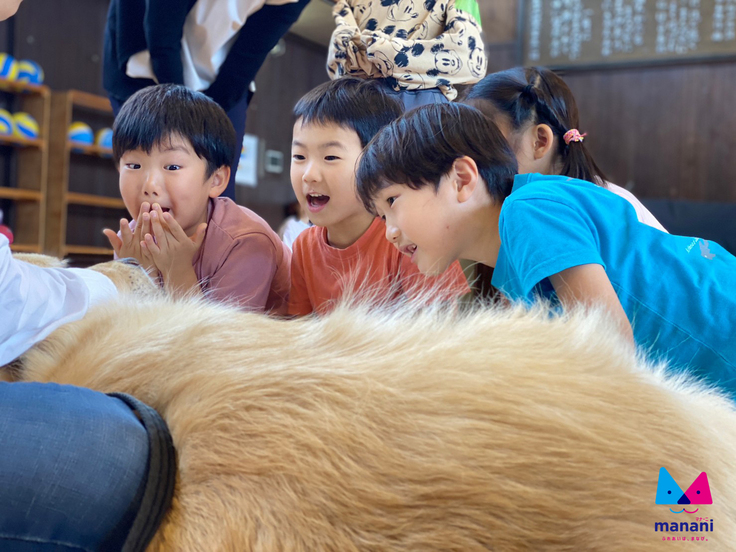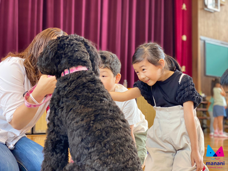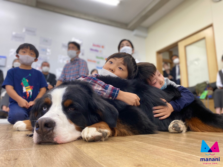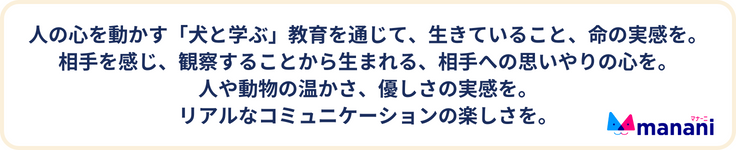 私たちは、全国の国公私立小学校で「犬を介在した教育」を、文部科学省や環境省の後援名義を得て、無償で授業実施をしています。 犬とのふれあい学習には、命の温かさを感じ、人にも動物にも優しくできる「心の学び」が沢山つまっています。 授業名:こども笑顔のラインプロジェクト 主催:一般社団法人マナーニ