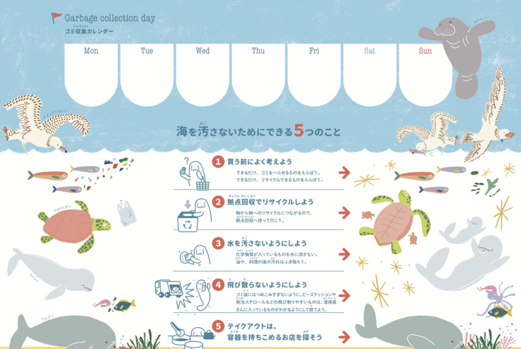 私はフリーランスアーティストとして、カラフルで親しみのある、自分も周りの人々も幸せや喜び感じてもらえるようなイラストコンテンツや楽曲を制作しています。持続可能な考えのもと、ささいな幸せを見つけてを作ることを大切にしている中で、マナティー研究所さんと出会い、「海を汚さないためにできる5つのこと」という海ごみ問題にアプローチするプロジェクトなどのイラスト制作で関わらせていただきました。