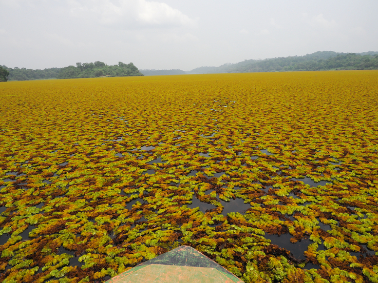 この数年で、オオサンショウモがオッサ湖周辺の湖や川で大繁殖してしまい、マナティーの餌植物を枯らせたり、地域の人たちの漁業ができなくなっています。また、最近の調査によって、マナティーたちはオオサンショウモが繁茂しているエリアを利用しなくなっていることもわかってきました。