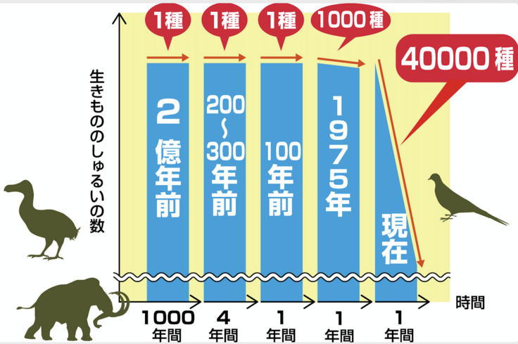 しかし、過去に、⽣きものが減ったり、絶滅したりしたことで、予想していなかった環境の悪化や、取り返しのつかない変化が起こったことがあります。