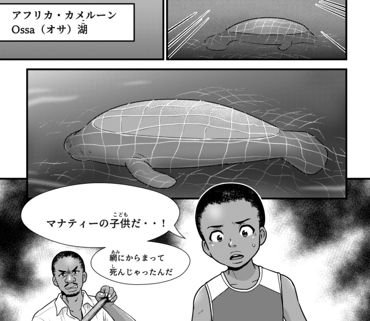 驚かれるかもしれません。けれども、日本では水族館でマナティーに会うことができますが、カメルーンには水族館がありません。また、湖が泥で濁っているので、水中のマナティーを見ることもできません。現地の子供も大人も、マナティーがどんな動物か、知る機会がないんです。