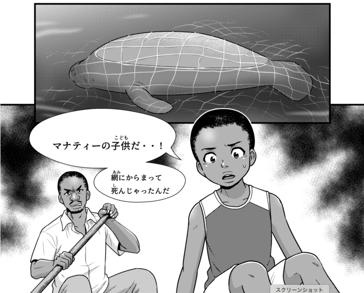 カメルーンのマナティーの問題をわかりやすく紹介するために、マンガ冊子を作成して、無料で配布しています!
