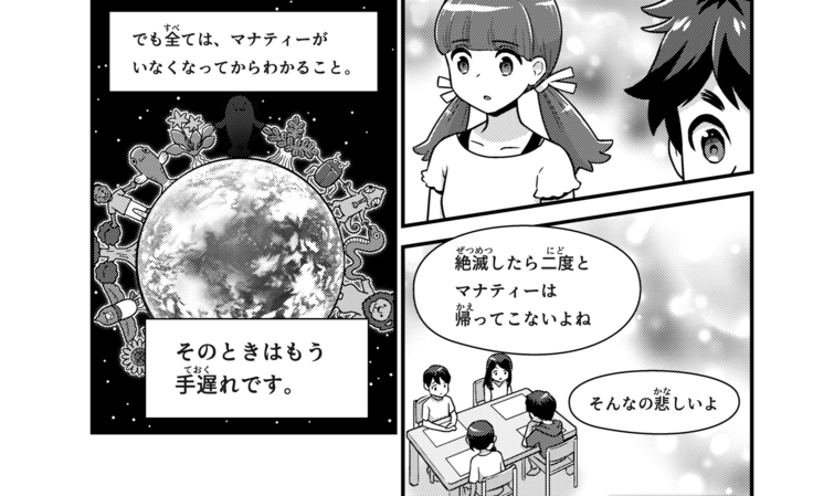 もしも、マナティーが絶滅してから、「ああ、こんな大変なことになるなんて…」と後悔しても、それはもう手遅れです。だからこそ、失う前にその⼤切さを知り、多くの⽣きものとともに⽣きることを⽬指す必要があります。