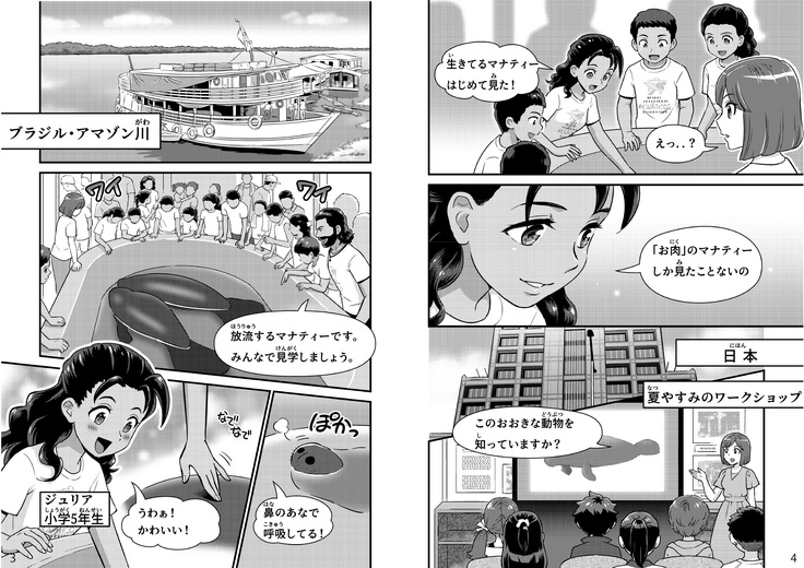 日本では水族館や動物園に行けば彼らに出会うことができます.しかし,海外,特に私たちが活動している南米のアマゾン地域やアフリカでは,マナティーに出会える施設はありません.現地では,自分たちのすぐ近くに暮らしているマナティーを一度もみたことがない人や,マナティーをお肉の状態でしかみたことがない人も多いのです.