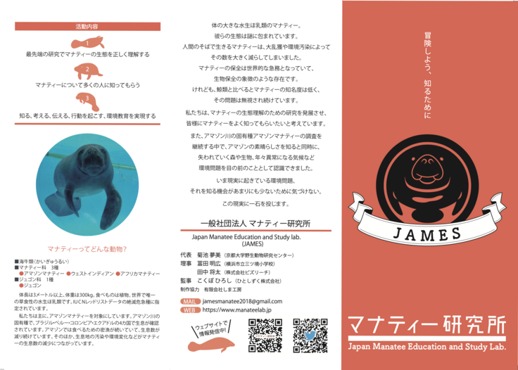 はじめまして,生きもの・自然環境にまつわるデザインや教材を作っている者です.道端にいるスズメから,砂浜に訪れるアカウミガメ,海で生まれ川を上るウナギなど,NGOや研究者の方々と日本の生きものを対象にお仕事をしてきました.菊池さんからお話しを伺い,マナティーのパンフレットや「きって,はって,マナティーパズル」という教材を作らせていただきました.生きものの保全には[保全計画を立てるのに必要なデータを取るための調査]と[その生きものがいる地域に住む方々のご理解とご協力を得ること]が欠かせず,菊池さんは双方に熱心に取り組める方です.また,日本から距離のあるマナティーたちの生息地も,私たちの生活圏とつながりがあることを説明できる方だと思います.是非ご協力お願いいたします