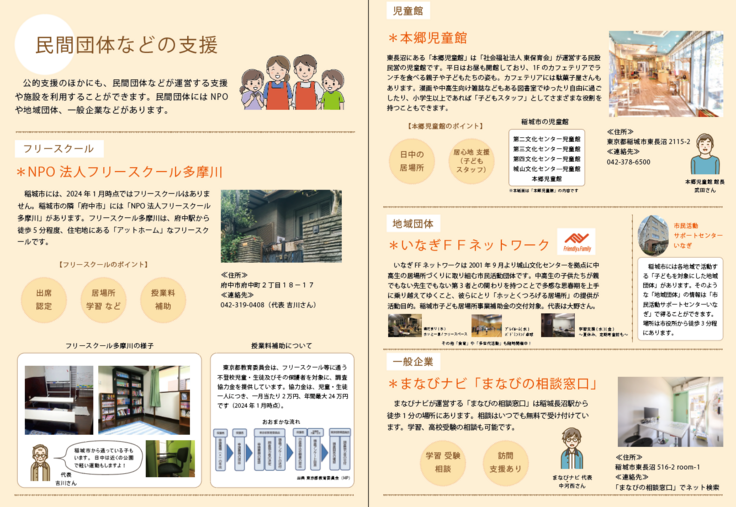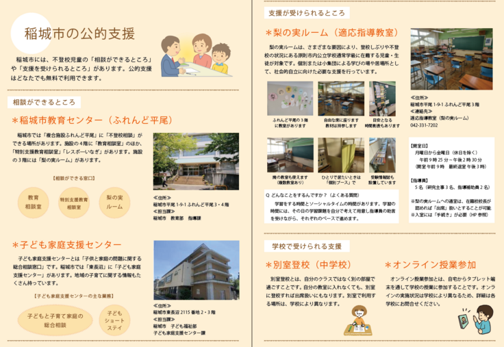 稲城市の「不登校支援」に関する情報をまとめた冊子を作成、配布しています。2024年2月より配布を開始し、市内の公立小中学校にも配布をしています。冊子の作成費用はクラウドファンディングで地域の有志の方よりご提供を頂きました。冊子の配布開始以降、多くのご好評の声を頂いております。現在も「まなびの相談窓口」で無料配布しています。
