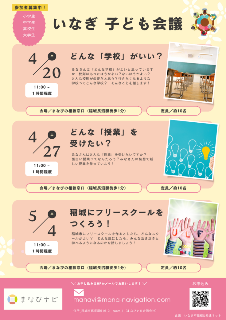 いなぎ地域に特化した「不登校」に関する情報サイトです。地域の支援や近隣地域の支援情報などを配信しています。また、定期的に「保護者の交流会」「何でも相談会」「子どもの無料学習会」を行っています。