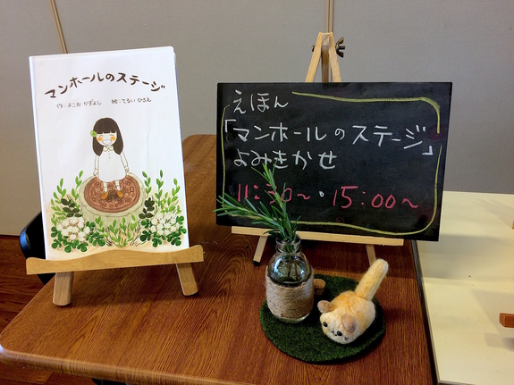 ブースではポストカード・他のオリジナルグッズの販売、ワークショップを開き、そして、11:45〜、15:45〜の2回には絵本読み聞かせのイベントを開催し、「マンホールのステージ」を初めて人前で披露する機会をいただきました。
