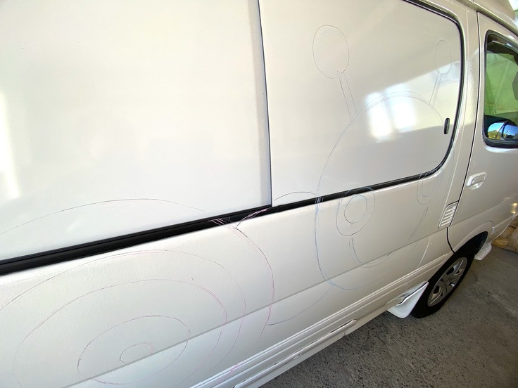 先日、落合地区で活動されている『アートグループmo』の松岡さんが来られて、車にペイントする『あぐりんちょ虫』の下書きをしてくださいました!かわいい!