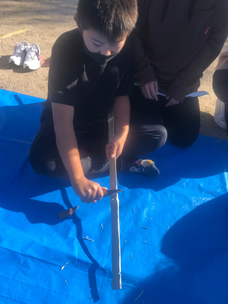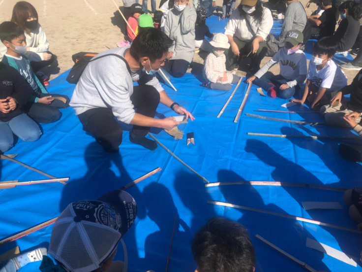 子ども達も慣れない小刀での作業に悪戦苦闘しながら、竹を削って弓の本体を作り、ツルを張って(これが結構力が要るので、地味に大変なんです)、弓が完成!